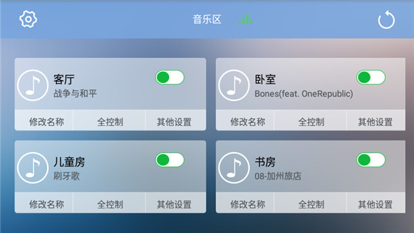 最大亮點:實現了兩個通道的完全獨立控制,兩個房間可以獨立開關機、控制音量大小、選擇音源、播放不同音樂等。