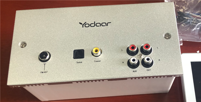 功放有點分量,磨砂金屬材質,摸起來很有質感,正面的接口從左到右依次為:本地FM、光纖(Toslink)、同軸(Cosxial)、 外接AUX、輸出OUT。
