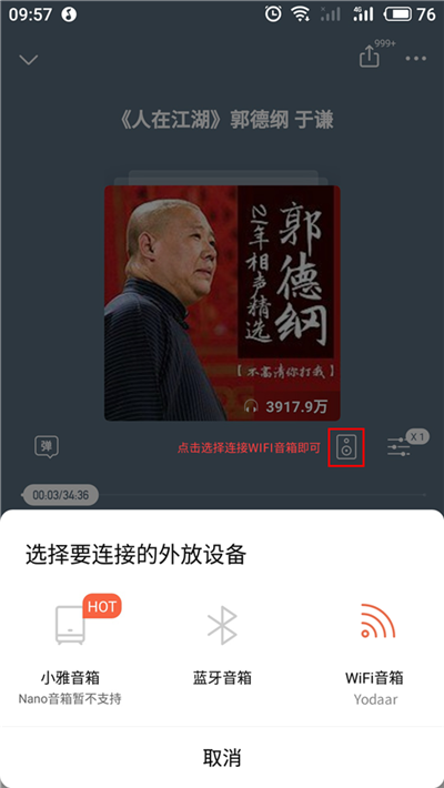 下載完之后就可以返回首頁,隨便點擊你想聽的節目,通過界面上的按鈕連接外部設備,系統就能同步播放啦~其他音樂軟件的設置也類似,網易云音樂是打開DLAN設備,QQ音樂是打開QPlay,大家可以去試試。